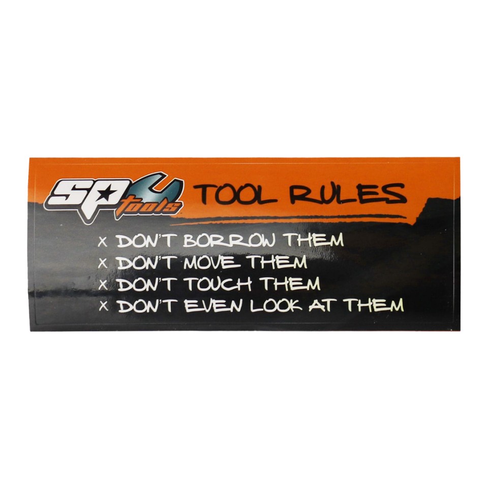 Enhance your workspace with the SP Tools Tool Rules Sticker and enjoy a bit of fun while maintaining order. Perfect for professionals who appreciate a good laugh and value their tools.