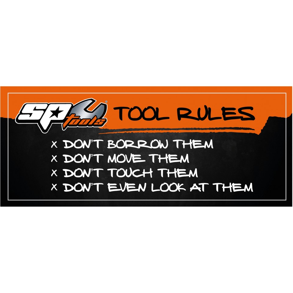 Améliorez votre espace de travail avec l'autocollant SP Tools Tool Rules Sticker et amusez-vous tout en maintenant l'ordre. Parfait pour les professionnels qui apprécient de rire et qui attachent de l'importance à leurs outils.