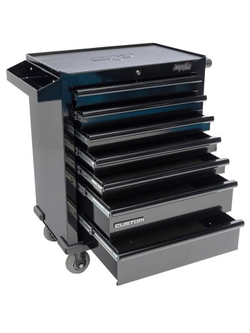 Met de handgreep aan de zijkant van de wagen is de wagen gemakkelijk te sturen en ben je super wendbaar en flexibel tijdens het werken. De wagen kan ook worden uitgebreid met een bijpassende bovenkast of trekhaakkasten voor extra opslag. De Custom Series Gereedschapswagens zijn verkrijgbaar in zwart metallic en met drie verschillende kleurhandgrepen, zodat je perfect kunt afstemmen op je huisstijl. Als je een speciale kleurwens hebt, neem dan gerust contact met ons op.