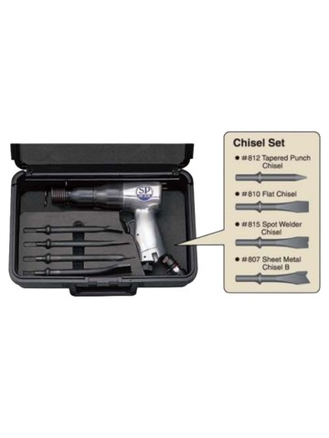 De SP-1410K Luchthamerset is een pneumatisch werktuig dat wordt geleverd met een luchthamer en vier beitels om verschillende klussen aan te pakken. De set is ideaal voor taken zoals het verwijderen van roest van uitlaten en buizen, het snijden van carrosseriepanelen en het losmaken van spotlassen. De luchthamer heeft een vrije snelheid van 3000 slagen per minuut en gebruikt een duurzame stalen cilinder voor langdurige prestaties. Dankzij het snelwisselsysteem kun je snel en eenvoudig van beitel wisselen, wat flexibel werken mogelijk maakt.