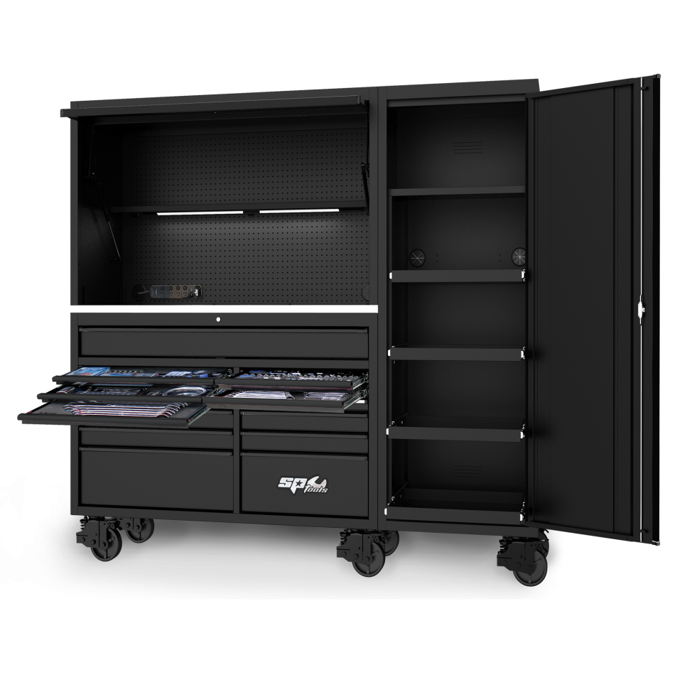 Szafka na kółkach z serii USA od SP Tools to najlepsza stacja robocza. Dzięki niezwykle wytrzymałej konstrukcji z podwójnymi ściankami ze stali 2 x 1,5 mm i obciążeniu ponad 400 kg na wózku, ta szafka na kółkach jest nie do pobicia. Szuflady są w stanie wytrzymać obciążenie do 120 kg każda i są wyposażone w "One Touch Click-lok" i "Kitchen Style Softclose", co sprawia, że praca z nimi jest bardzo przyjemna.